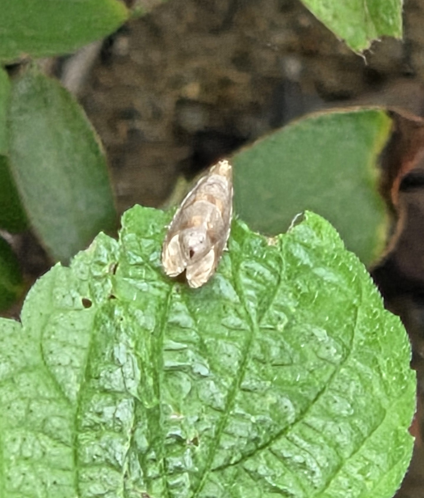 模様があまりなく、特徴が乏しいです。ヤガ科と思いますが、見つかりません。